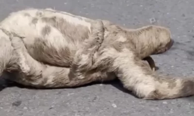 Preguiça com filhote nas costas é flagrada atravessando estrada na zona rural de Parintins