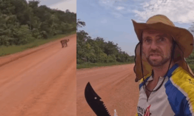 Ciclista bielorrusso dá de cara com onça-pintada na BR-319 e foge pedalando; assista