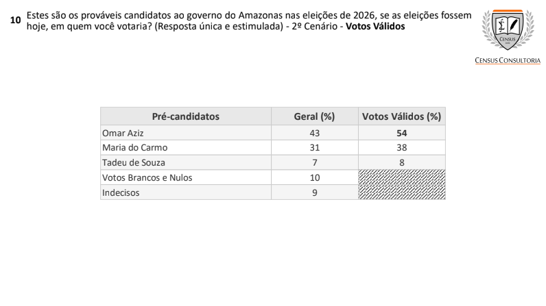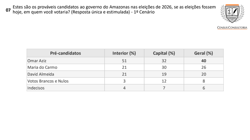 Uma pesquisa divulgada pelo Instituto Census na manhã desta sexta-feira (5) mostra uma ampliação de vantagem para o atual senador Omar Aziz (PSD-AM) no interior do Amazonas, na disputa ao cargo de governador, bem como uma disputa acirrada com Maria do Carmo Seffair (PL-AM) na capital, e uma larga rejeição ao prefeito de Manaus, David Almeida (Avante).