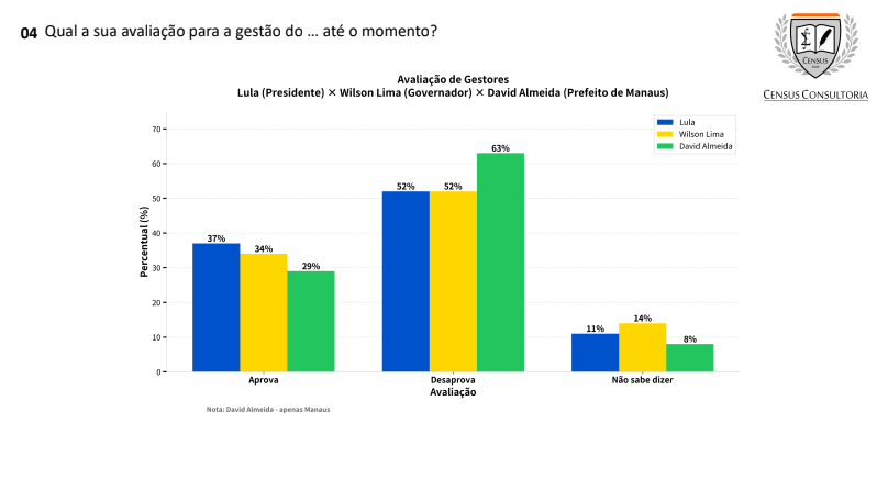 Mesmo múmero é visto na forte desaprovação ao mandato do presidente Luís Inácio Lula da Silva, com 52%. Já o atual prefeito de Manaus, David Almeida, a desaprovação chega a 63%, um recorde absoluto desde o início das manifestações.